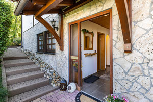 Die Wohnung hat einen eigenen, befestigten Zugang an der Seite des Hauses, sowie eine Terrasse, die nach Süden ausgerichtet ist und mit zünftigen, rustikalen Holzmöbeln versehen ist. Auch